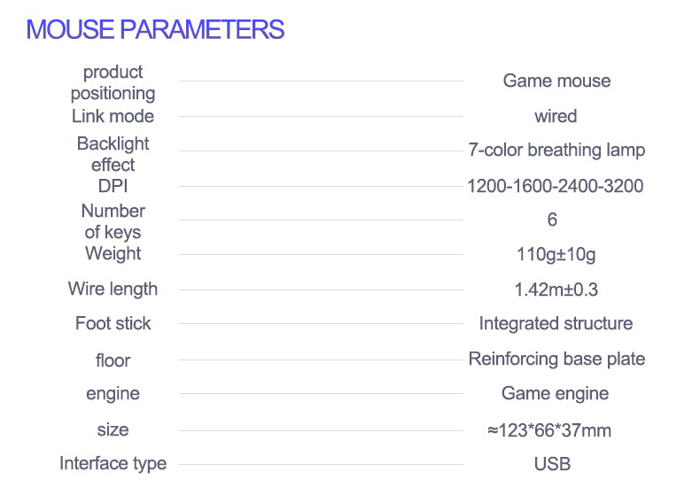 Introducing the Dragon 6 Buttons Gaming Mouse with 4 adjustable DPI levels and built-in breathing light. Perfectly designed for gaming, the upgraded 6D key position layout allows for quick operation. The mouse boasts a high-speed positioning laser-game engine and enhanced durability game-level micro-motion, which can move quickly and click accurately. The seven color breathing light effect creates a flowing light that changes as you play. The mouse includes one key speed regulation and game-specific white dot micro-motion for strong rebound and a long lifespan. The mouse is wired and has a 7 color breathing backlight, 6 keys, and non-slip mat foot pads. The gaming mouse comes with a USB interface and weighs 110±10g. Package includes 1 Gaming Mouse.