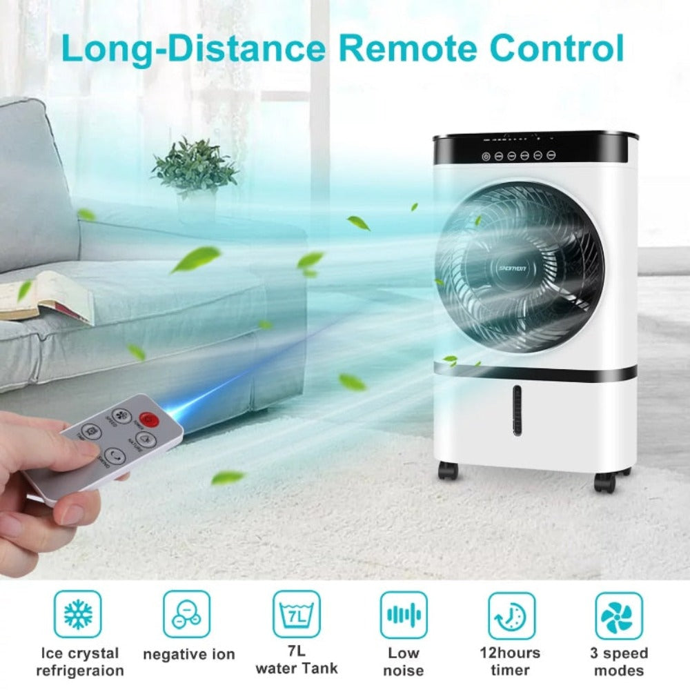The highly efficient and versatile 7L Portable Evaporative Air Cooler Fan with Remote Control is designed to provide refreshing air in any indoor space. This compact and portable cooler is perfect for bedrooms, living rooms, offices, or outdoor areas like patios and decks. Utilizing advanced evaporative cooling technology, this air cooler fan effectively lowers the temperature by utilizing water evaporation. With a generous 7-liter water tank capacity, it can operate for hours without frequent refills. The user-friendly design includes a remote control for convenient distance adjustment. It offers three fan speeds, two cooling modes, and an oscillation function for even air distribution. The built-in timer saves energy, while the sleek and modern design seamlessly blends into any decor. Enjoy a refreshing and comfortable atmosphere with the 7L Portable Evaporative Air Cooler Fan with Remote Control.