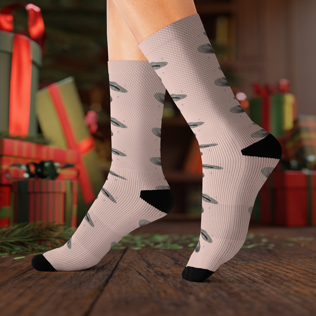 Experience optimal comfort and style with these premium quality UFO print socks, perfect for accessorizing a professional look or adding a bold statement to your wardrobe. Available in three sizes, these socks feature a ribbed tube and cushioned bottoms for maximum comfort. Made with a blend of polyester, acrylic, nylon, and spandex, they have a comfortable fit that is sure to please. Check the size guide for the perfect fit, with total lengths ranging from 13 to 16.15 inches and a width of 3.94 inches. Choose from women's sizes 6-8 to 11.5-13 and men's sizes 5-6.5 to 10-13.