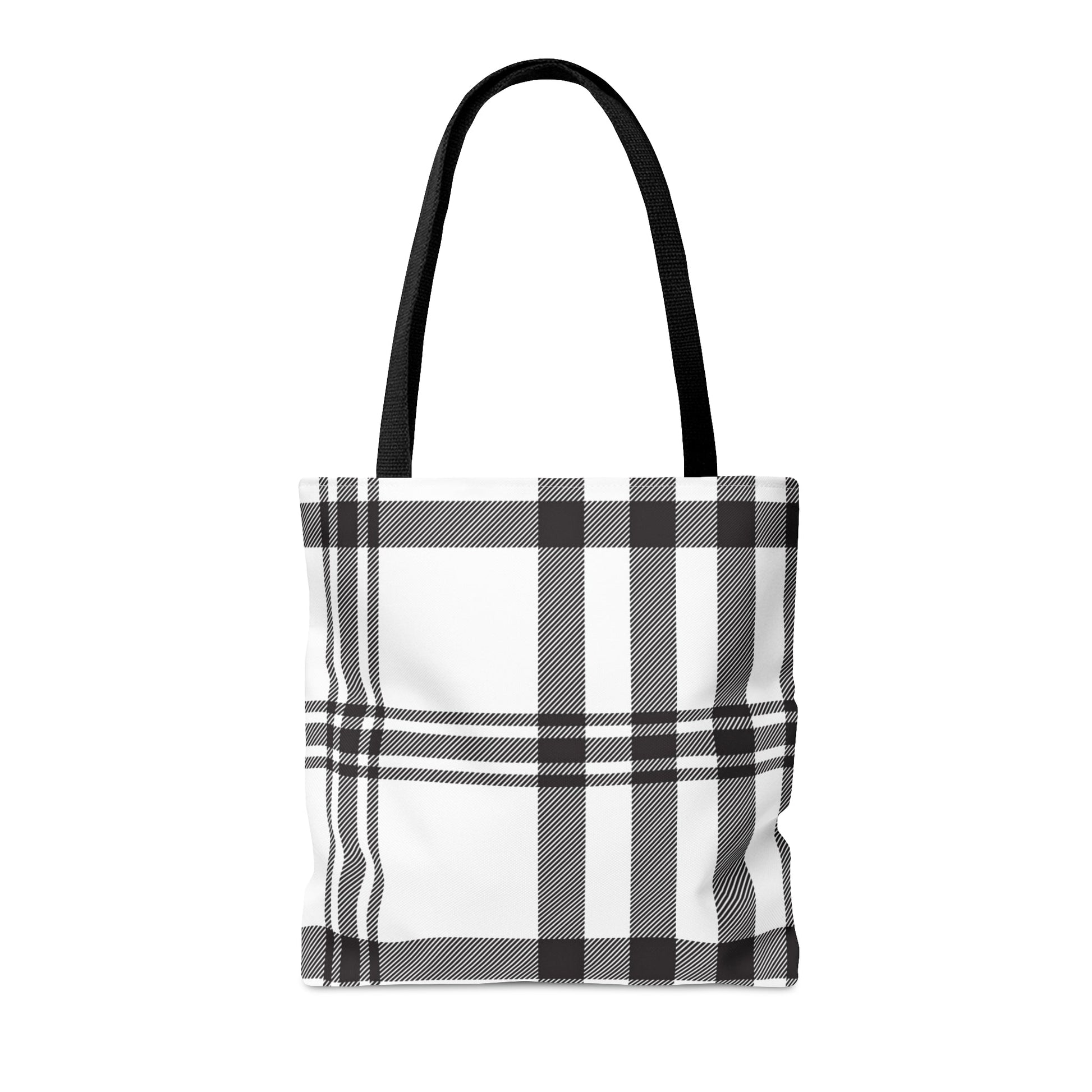 This versatile Black and White Plaid Tote Bag is perfect for everyday use. Its chic and comfy design makes it ideal for the beach or a day out in town. Made from high-quality, long-lasting materials, it's built to withstand the seasons. The tote bag features boxed corners and black cotton handles for durability and ease of use. With dimensions of H 16.03" x L 16.03" x W 3.15" and handle height of 11.82", it's roomy enough to carry all your essentials. Crafted from 100% Polyester, it's stylish, practical, and perfect for any occasion.