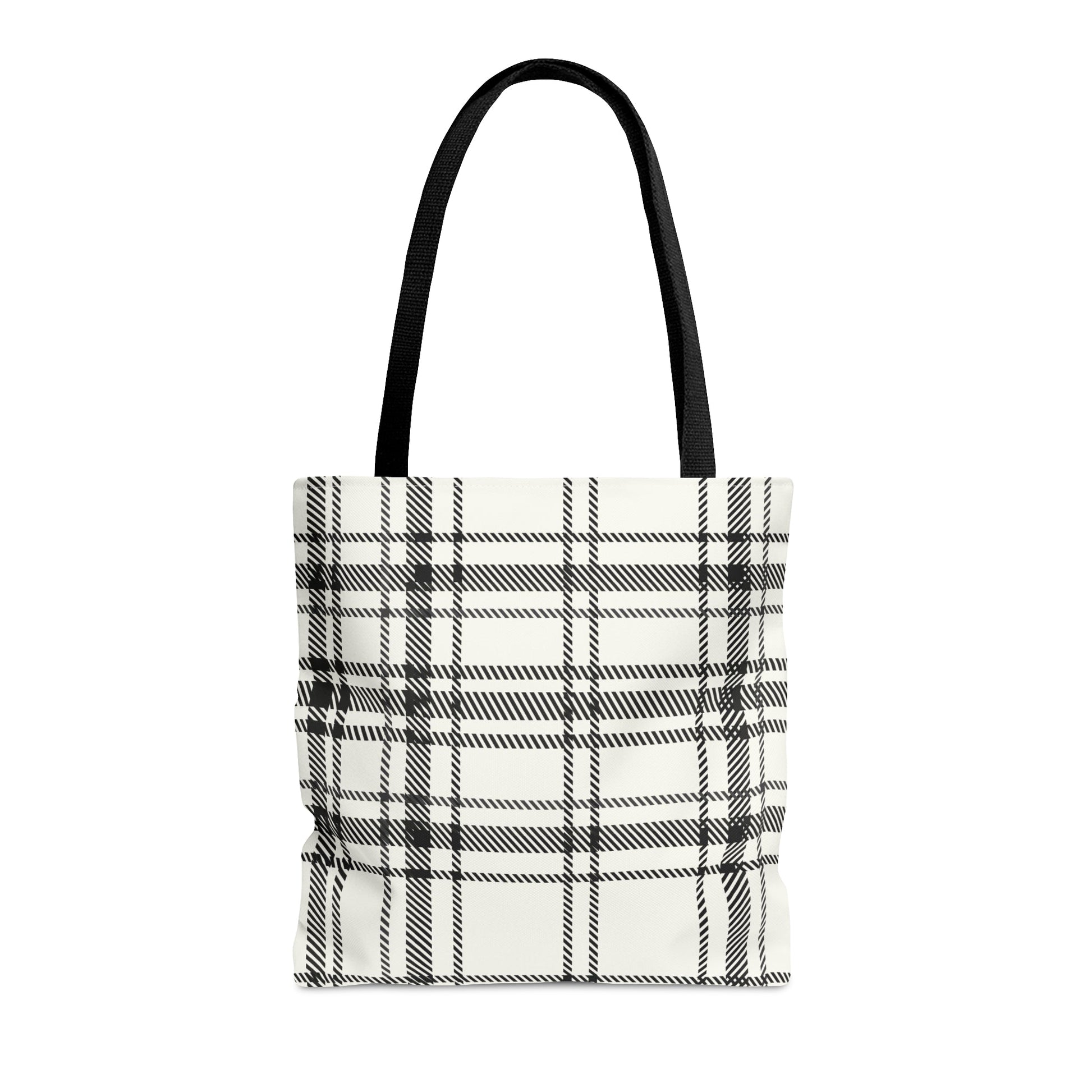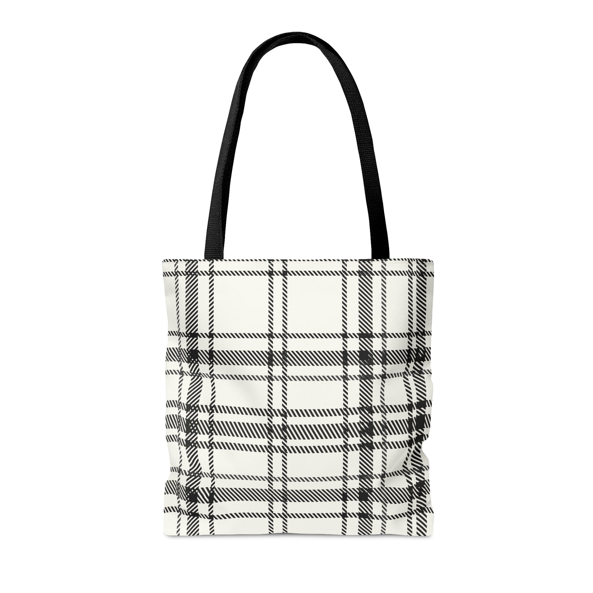 Black and White Plaid Tote bag for everyday use. This chic and fashionable tote is perfect for the beach or a day out in town. Crafted from durable materials, ensuring long-lasting quality throughout the seasons. Made of 100% Polyester, this tote features boxed corners and sturdy black cotton handles. Its dimensions are H 16.03" x L 16.03" x W 3.15", with a handle height of 11.82".