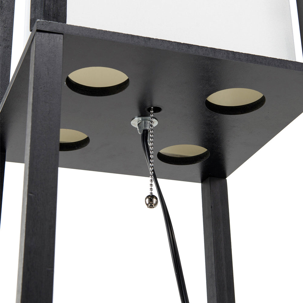 Modern Standing Post Lamp adds a touch of sophistication to any room, featuring convenient wood shelving for displaying art or books and stylish fabric shades. Its sleek design creates a contemporary ambiance.