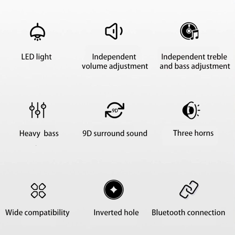 Introducing the Bluetooth Tri Speakers System - a versatile addition to your audio setup. This system offers high-quality sound with a powerful bass, adjustable treble and bass, and a range of connectivity options. The soft LED colorful lights create a dynamic and immersive atmosphere, perfect for watching movies and playing games. With dual full-range drivers and 3W*2 full-bodied stereo sound, this system produces a rich and immersive audio experience. Connect wirelessly with Bluetooth 5.0 or use the included 3.5mm AUX cable for wired connection. Powered by a USB cable, this system is easy to set up and use. Available in black or white, this Bluetooth Tri Speakers System is the ultimate sound solution for your home or office. Package includes main speaker, side speakers, and manual.