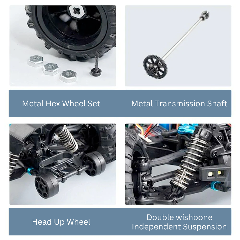 Get ready for an exhilarating ride with the Dragon Conquer Fighter High Speed RC Car! Equipped with metal springs, this shockproof and durable car can withstand rough surfaces and unforeseen drops. With a top speed of 50 km/hr and 4WD, this power-packed car provides extreme tire scorching action. The car can drift and climb up to 45 degrees on all terrains, including grass, sand, rocks, and mud. The 2.4 GHz RC control allows for indoor and outdoor use with a remote distance of over 80 meters. The car provides a real simulation feel with stepless speed, fast acceleration, deceleration, reversing, braking, and right-to-left turns. The car comes with a powerful collision assistance design and provides 10-15 minutes of play time depending on the speed mode setting. The package includes the RC car, remote controller, and USB cable.