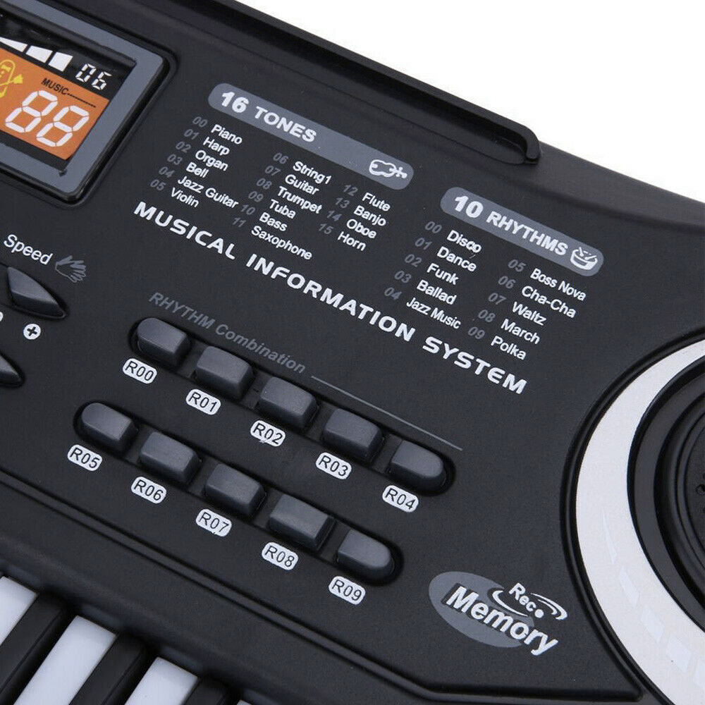 Indulge in endless hours of amusement with this fantastic electronic keyboard designed for children. With 61 keys and a built-in microphone, young musicians can sing while they play, cultivating their musical abilities. Explore the marvelous features, including 16 different tones, 10 diverse rhythms, and 6 captivating demos. Experience the convenience of playing through a power supply outlet or batteries. Crafted from durable plastic, this keyboard boasts a US plug and dimensions of 2.17" x 21.26" x 6.69". The package includes 1 keyboard, 1 microphone, 1 manual, and 1 charger. Please note that the left speaker is purely decorative. Let the musical journey begin!