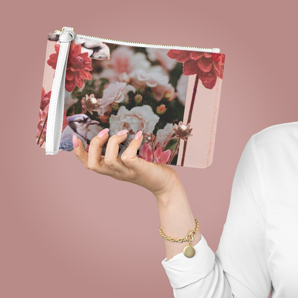 Elegant Floral Zippered Clutch - Crafted with a convenient loop handle, this chic clutch is tailored for the stylish trendsetter on the move. Ideal for carrying daily essentials like a phone, wallet, and keys. Boasting a secure zip closure and a fully lined interior compartment. Expertly crafted from cruelty-free leather in a sophisticated Saffiano textured design.