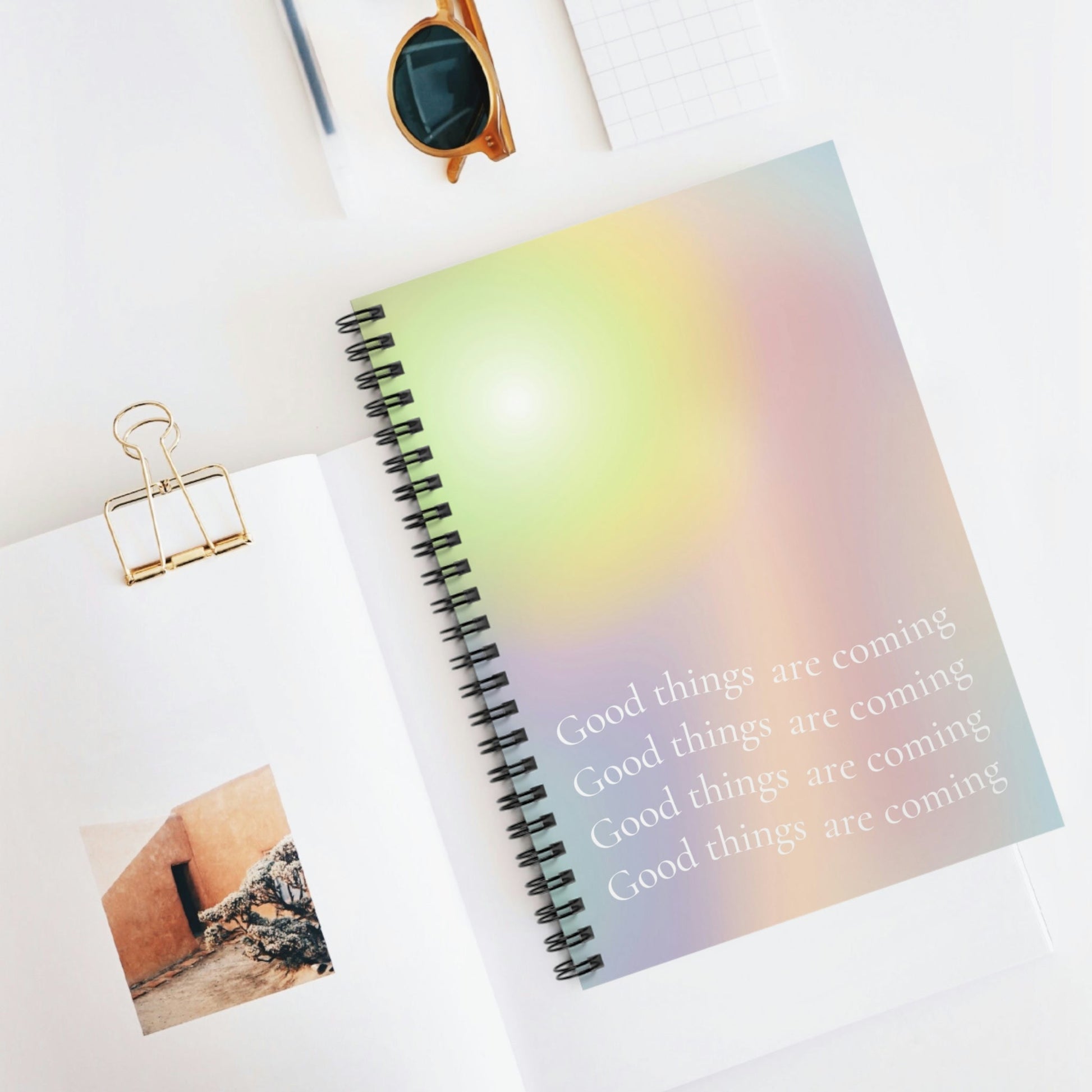 The Good Times Await Spiral Notebook boasts a chic and stylish design that is right on-trend. This handy lay-flat notebook is perfect for jotting down notes and musings throughout your day. It comes with 118 pages of ruled line paper, providing ample space for all your needs. The front cover features a beautiful print that is sure to catch the eye, while the back cover comes in a sleek and sophisticated dark grey. With 59 sheets to fill, this notebook is an ideal companion for everyday life.
