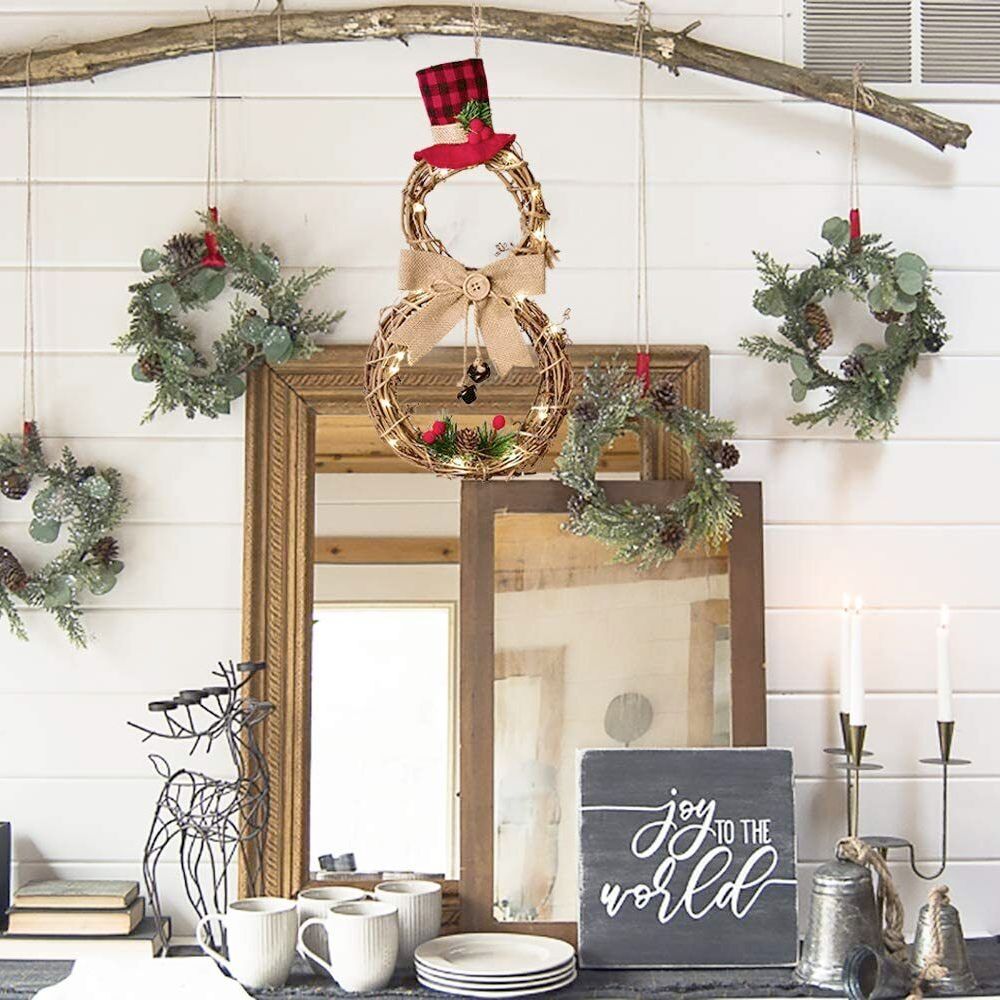 This large illuminated snowman wreath decoration is perfect for adding a festive touch to your home during the holiday season. It can be hung by the fireplace, tree, or front door to create a warm and inviting atmosphere. Additionally, it makes a great theme for doors and is versatile enough to be used in any room. Made of cloth, linen, and tree branch, this lightweight decoration weighs only 0.33 pounds and measures 15.7 inches by 8.3 inches. Get in the holiday spirit with this charming snowman wreath decoration.