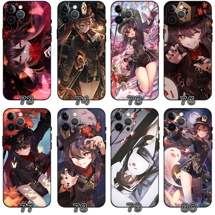 This phone case is made of durable TPU material and has a raised edge to protect your camera. It features a unique design inspired by the character Hu Tao from the game Genshin Impact.