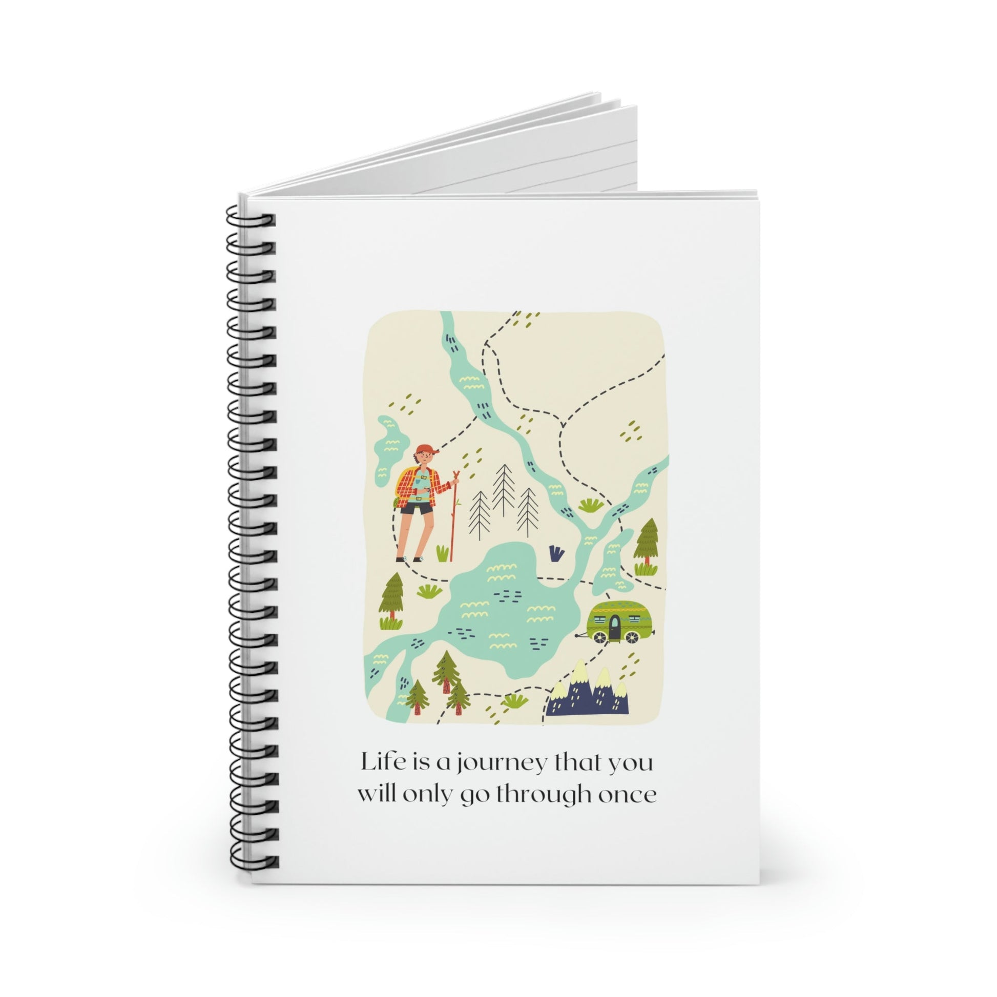 The Life is a Journey Spiral Notebook boasts a contemporary and chic design. This notebook lays flat and is ideal for jotting down notes, recording your daily thoughts, or penning positive affirmations. Its 118 pages of ruled paper make it the perfect companion for everyday use. The notebook is highlighted by its front cover print and dark grey back cover, while each page features ruled lines to keep your writing neat and organized. With 59 sheets in total, this spiral notebook is a must-have for anyone who values both style and functionality.