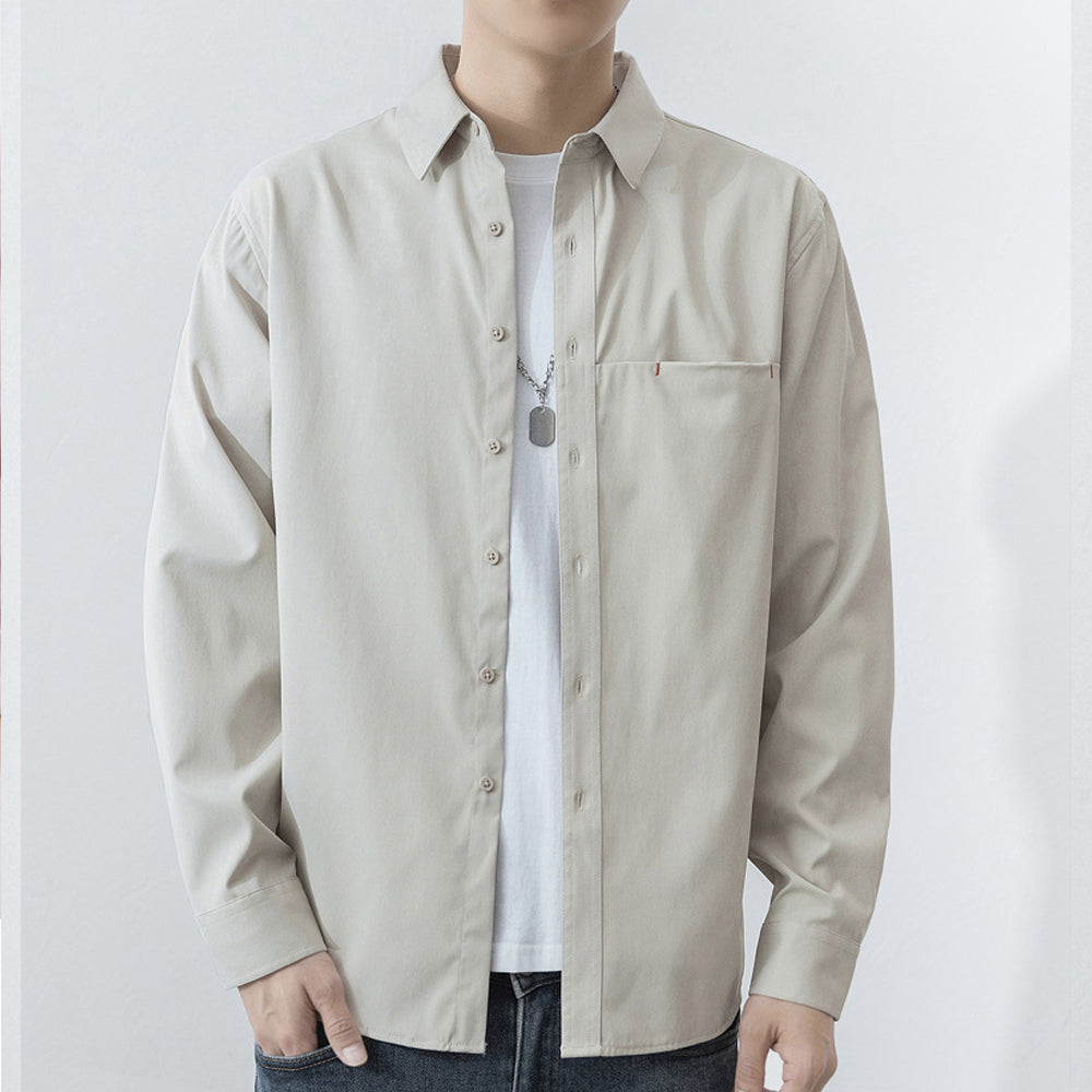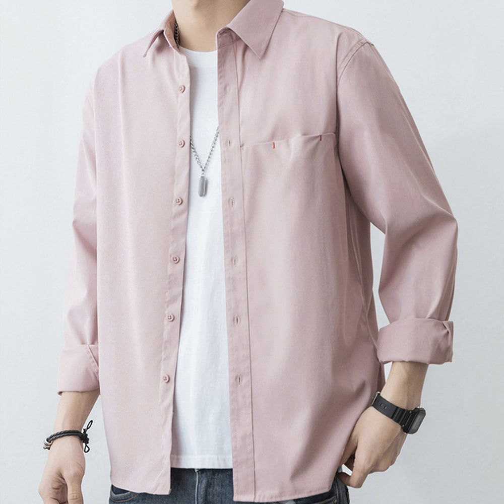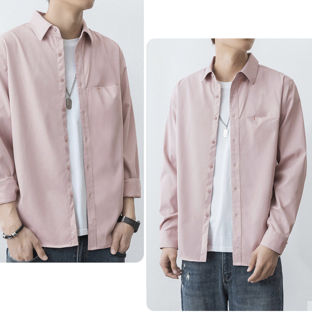 Relaxed fit men's shirt showcasing a button-down style with two prominent red stitches. Crafted from durable polyester fabric, this shirt is available in attractive colors such as pink, black, and beige. The loose fitting design ensures maximum comfort. Available in sizes XS, S, and M. The shirt's measurements are as follows: Size XS - Chest: 40.15", Length: 26.77", Shoulder: 17.71", Sleeve: 24.01". Size S - Chest: 43.30", Length: 28.34", Shoulder: 18.80", Sleeve: 24.80". Size M - Chest: 46.45", Length: 29.90", Shoulder: 20.07", Sleeve: 25.89". Please note that slight measurement variations may occur due to different measuring methods.