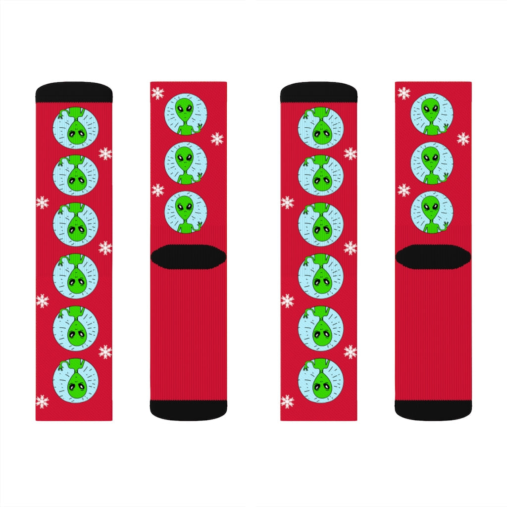 These socks are made with high-quality materials and feature a unique Alien print that combines comfort with style. They are perfect for adding a subtle accent to a work outfit or making an eye-catching statement with a more extravagant look. The socks come in three different sizes and are designed with a ribbed tube and cushioned bottoms for maximum comfort. Refer to the size guide for the best fit, with total lengths ranging from 13 to 16.15 inches and widths measuring in at 3.94 inches. Suitable for both women's and men's US sizes, these socks are the perfect addition to any wardrobe.