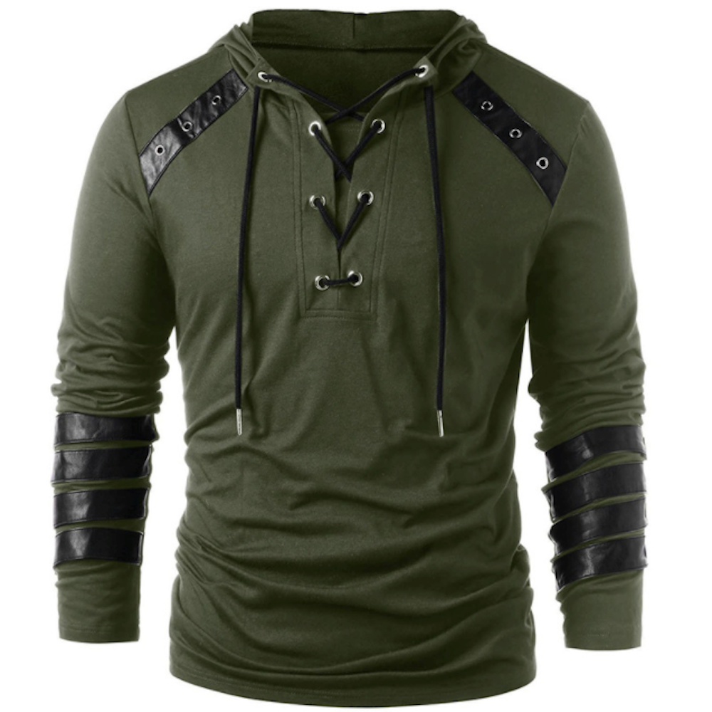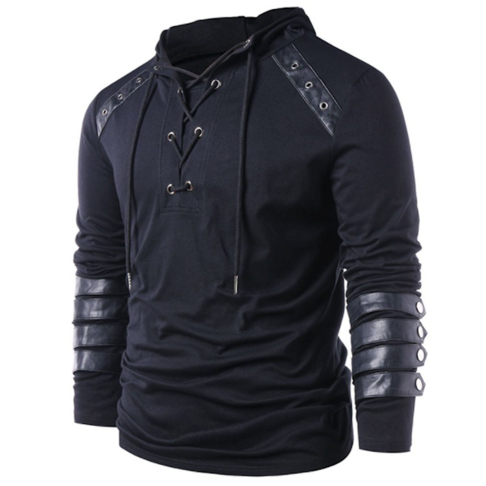 Pullover Hoodie for Men with Faux Leather Accents and Lace-Up Design