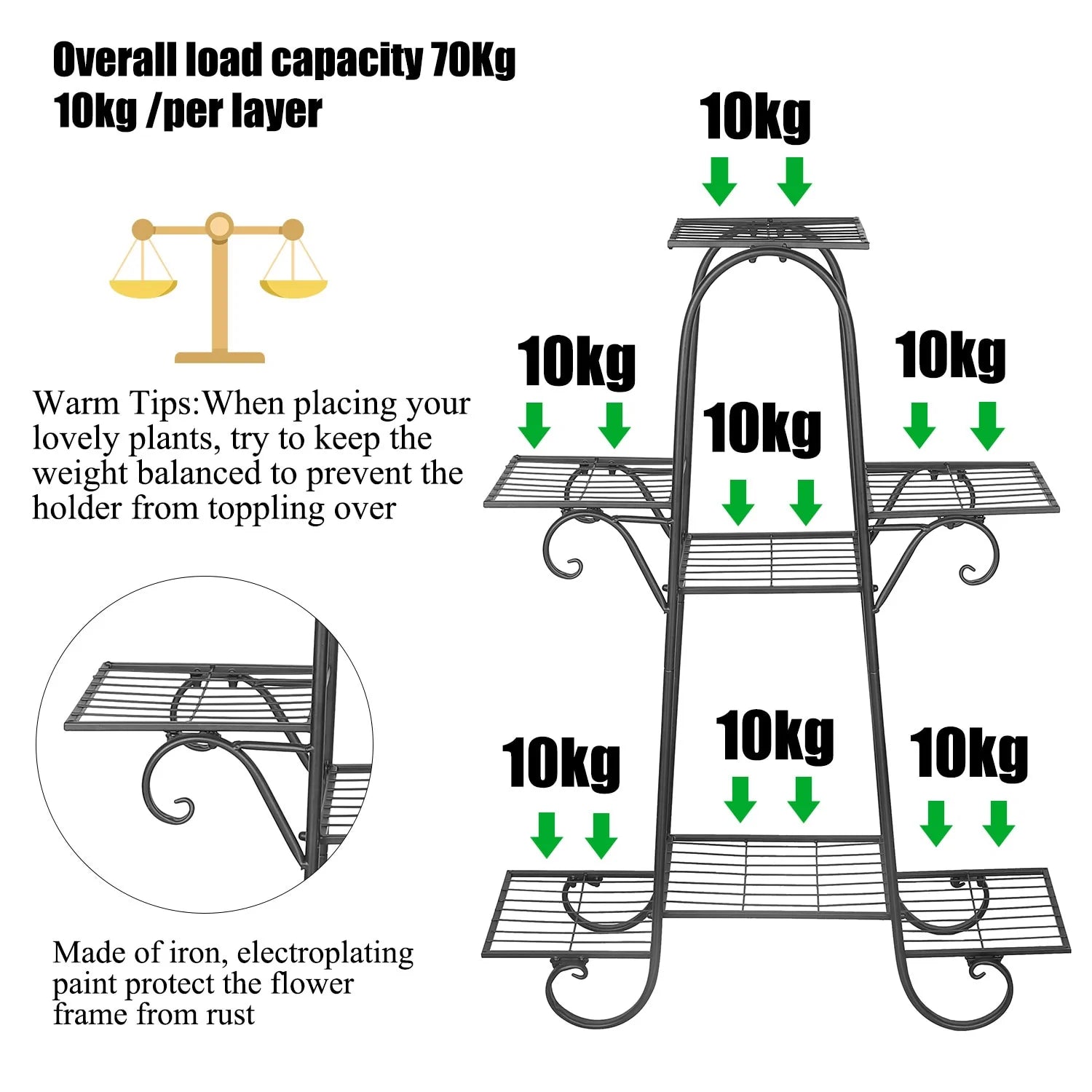 Enhance your home with the Metal 7 Pot Plant Stand. Embodying a timeless aesthetic, this metal stand offers dependable and robust support for your plants, whether indoors or outdoors. With its elegant design, it complements any living space effortlessly. The stand is made of high-quality iron and finished in a sleek black color. Its dimensions are L 26" x W 8.7" x H 40", providing ample space for your greenery. Each tier has a weight capacity of 22 lb, guaranteeing the safety of your plants. The package includes one plant stand, and for your convenience, we offer fast and free shipping within the USA (excluding Hawaii & Alaska). Achieve balance and style in your home with this versatile and reliable plant stand.