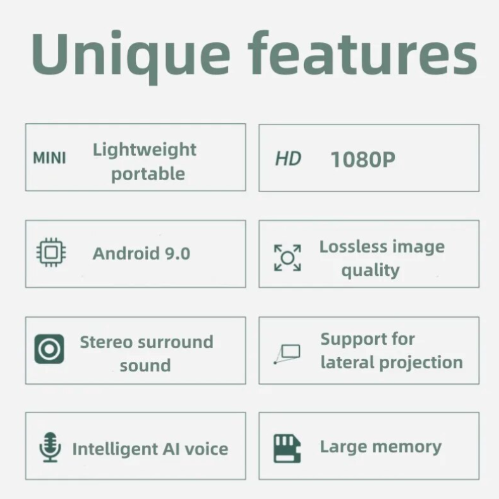 Upgrade your home entertainment with the Mini Portable Projector for Home Theater. This projector delivers a sharp, high-contrast picture with its advanced LED technology and short throw lens. It supports 1080p playback, ensuring an immersive cinematic experience. The projector is compatible with Android 9.0 and up, making streaming your favorite content a breeze. It also features lateral projection support for optimal viewing angles. Setting up the projector is easy with its HDMI and USB ports, or you can connect wirelessly via Bluetooth or micro SD card. Its compact size allows you to take it anywhere, and its long-lasting battery ensures uninterrupted entertainment. Get ready for an unparalleled visual and audio experience with this must-have gadget. Specifications include a white color, 6.3 x 5.1 x 4.7 inch product size, and 2.6 lb weight.