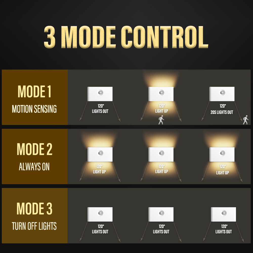 Illuminate your home with ease using the Motion Sensing Night Light. Efficient and convenient, this light is perfect for indoor or outdoor use. The motion sensor technology ensures the light illuminates the room when someone enters and automatically switches off after 20 seconds when the person leaves the sensing range. With three different light modes to choose from, you can customize the brightness to your needs. The magnetic design allows for easy installation and the super long battery life ensures you won't have to charge the light often. The two-way lighting feature prevents irritating glare while ensuring effective lighting. Sensing angle: 120°. Color temperature: 3000K. Power Source: Rechargeable Battery. Body Material: PVC.