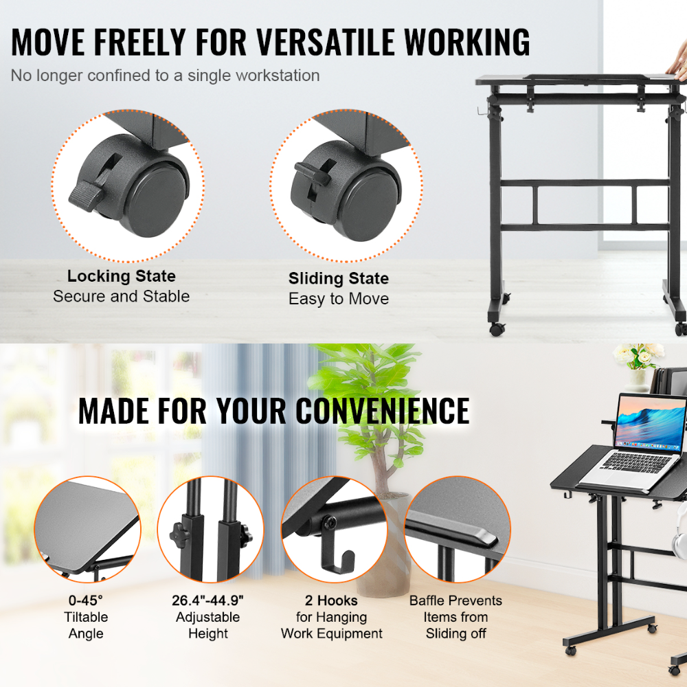 Enhance your workspace with our adjustable standing desk that allows you to effortlessly transition between sitting and standing positions. The tiltable desktop provides added comfort, while the spacious surface and 40lbs loading capacity accommodate all your work requirements. Utilize the included 2 "L" hooks for accessories. This compact desk features 4 x 360° rotation wheels (4 of which are lockable), providing easy mobility to any desired location. Elevate your productivity with this versatile desk that can serve as a multi-monitor computer desk, training podium, or drawing table. The desk's robust construction ensures stability and its generous workspace allows for various tasks. Dimensions: 23.6 x 23.6 x 26.4-44.9 in. Height adjustment range: 26.4- 44.9 in / 670-1140 mm. Tabletop Material: PB (Particle Board). Keyboard Shelf Material: PB (Particle Board). Table Legs Material: Q235 Carbon Steel. Total Loading Capacity: 40LBS /18.1 Kg pole.