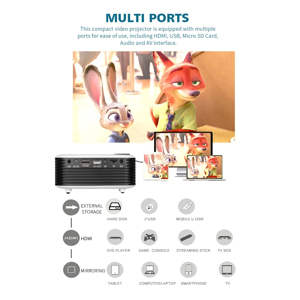 Experience a cinematic viewing in the comfort of your own home with the Mini Portable Home Theater Projector. Featuring 1080P high definition, this lightweight projector lets you turn any wall into a big screen to enjoy movies, videos, and gaming directly from your phone. The mini projector also supports power bank usage, making it perfect for on-the-go entertainment. With a high-power speaker and true color contrast ratio, this projector offers an excellent viewing experience. The package includes a remote control, power adapter, HDMI video cable, and instruction manual. Get yours today and enjoy 50,000+ hours of lamp life.
