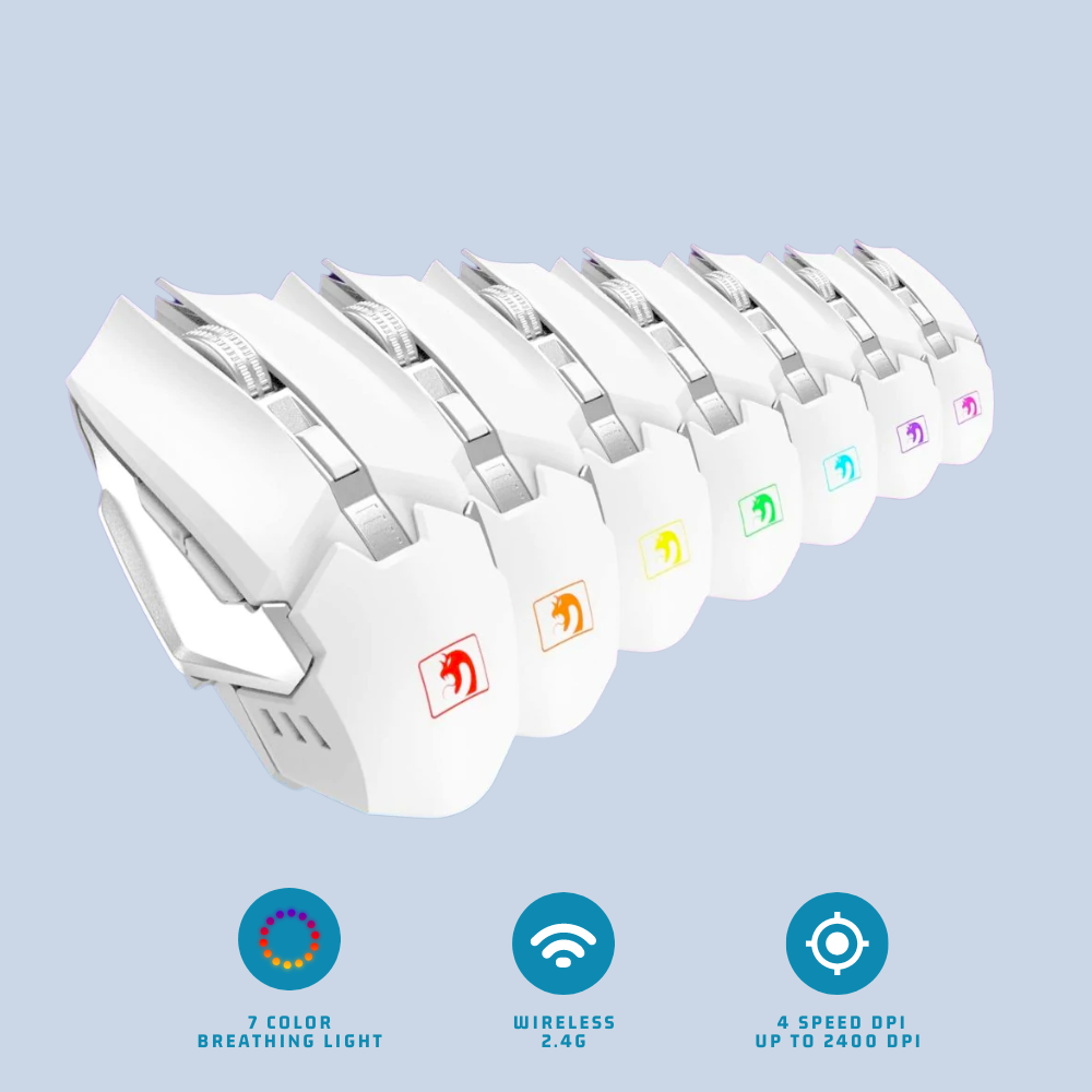 Introducing the Ninja Dragon V1X PRO Wireless 2.4G rechargeable gaming keyboard set, now available in 3 different colors with different backlights. Equipped with a metal panel and ergonomic mechanical feel, this keyboard set offers a fast charging feature for your convenience. With 2.4G wireless technology, you can enjoy a stable wireless control from a long range. The rechargeable gaming keyboard has a built-in 3000mAh battery, while the mouse has an 800mAh battery. The 6-button mouse has the latest electroplated craft double wing design and offers adjustable 4 speed DPI. The stunning backlight offers 3 modes, normal or breathing or off, with adjustable brightness and breathing frequency. The keyboard bracket includes a slot for a mobile phone bracket and a smaller side slot.