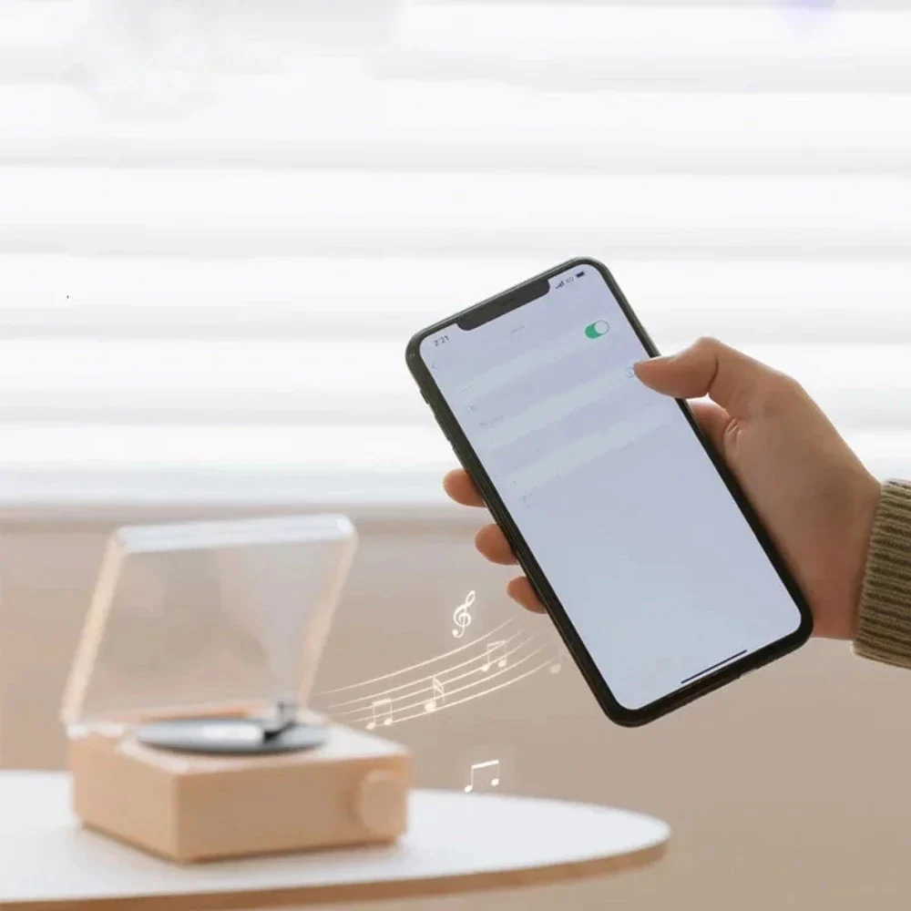 A versatile Bluetooth speaker with built-in alarm clock, encompassing timeless turntable elements in a modern and stylish design. Delivering exceptional audio quality through professional acoustic modulation, enjoy immersive, powerful, and authentic sound.