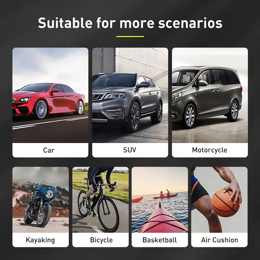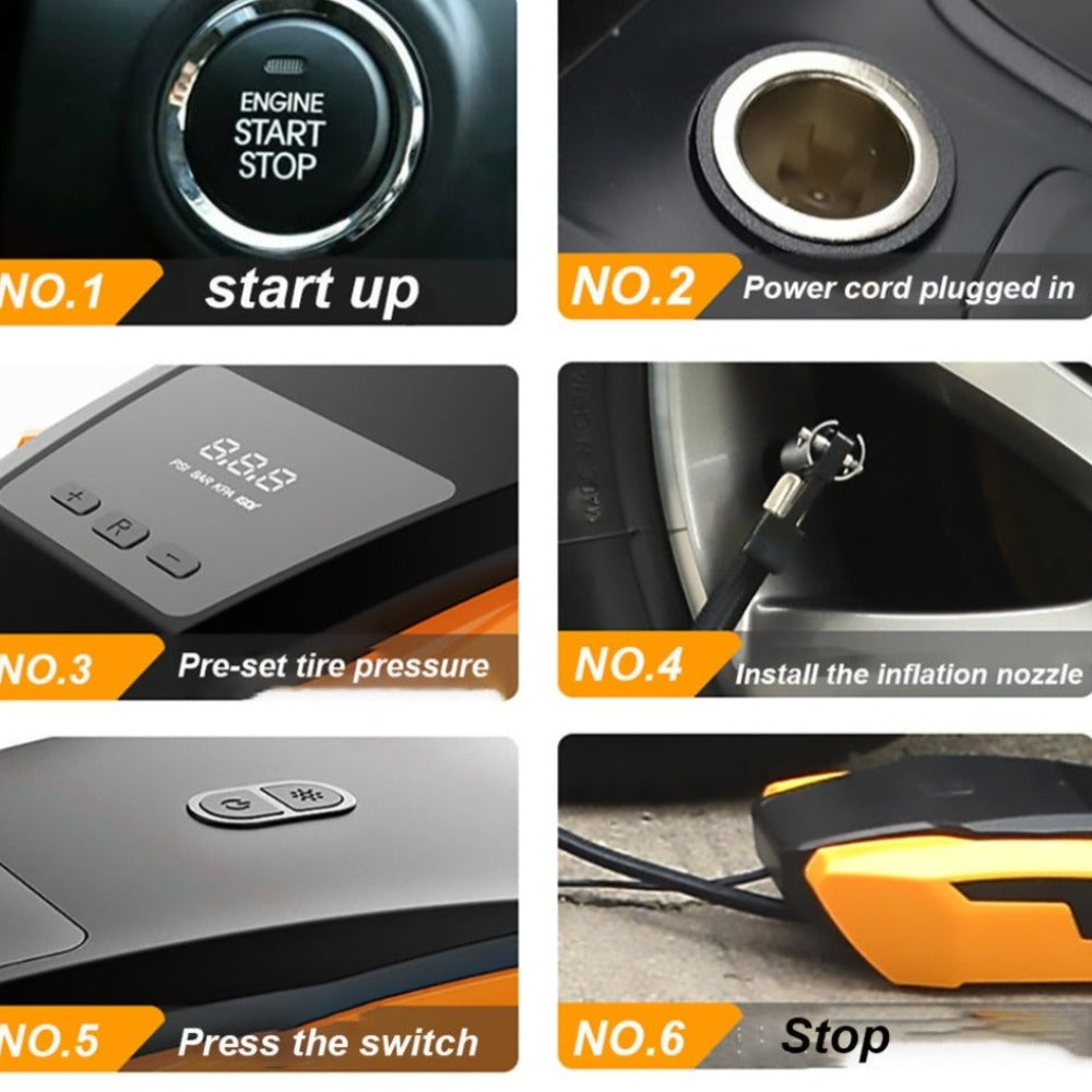 This compact and portable car tire inflator pump is a must-have for emergency roadside situations. It has a 14-foot-long power cord that is stored in the device, making it perfect for on-the-go use. This high-quality inflator is suitable for all types of vehicles with DC-12V cigarette lighter power sockets and comes with three nozzle attachments. It can also be used as an air pump for bicycles. The built-in safety feature includes a super bright automatic LED flashlight for night use. To use, simply connect the car plug to the power outlet, set the required PSI, and wait for the display to stop flashing. The package includes the air compressor, air hose, power cord, connectors for different applications, and a user manual.