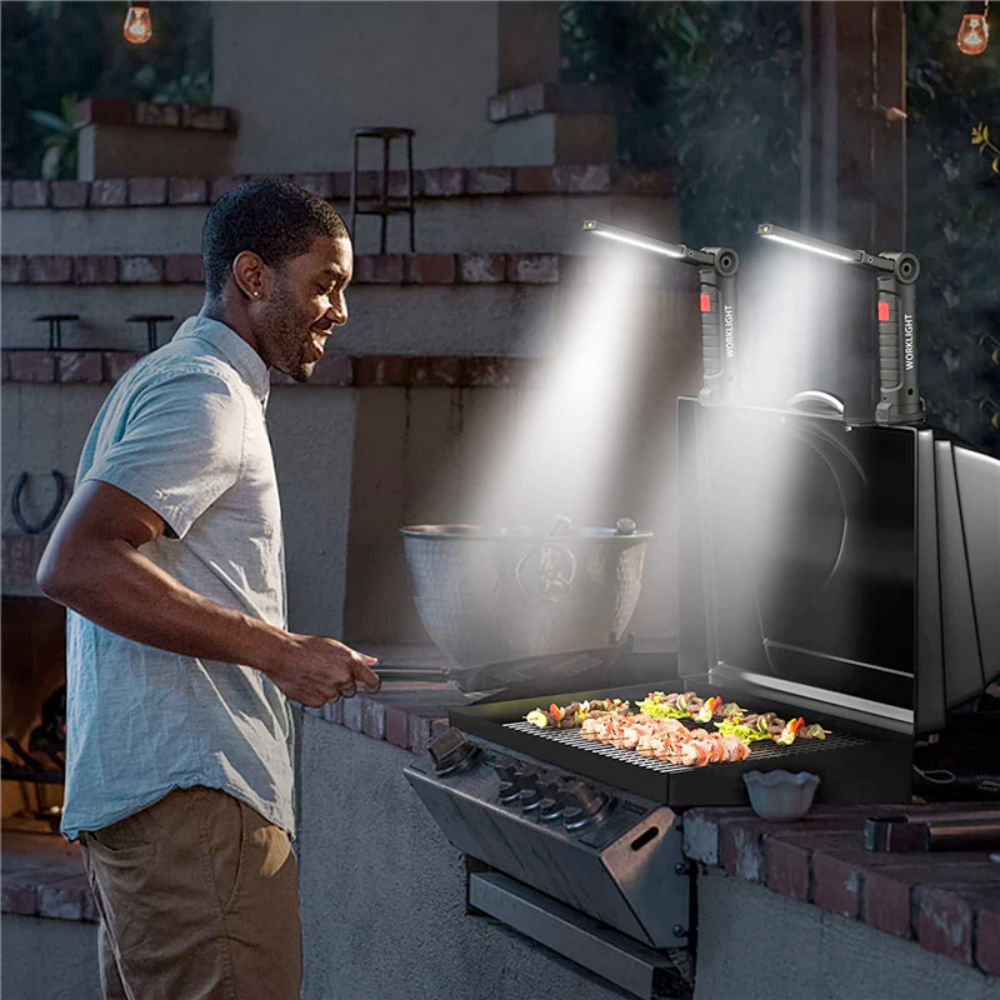 This versatile LED work light has 5 lighting modes, including high and medium brightness, front light, red warning, and strobe red. With 360° rotation, you can position it at any angle, and its magnet base and hook let you use it hands-free. It's perfect for BBQs, camping, car repair, and more. The COB LED light is rechargeable and comes with a USB cable. A fully charged battery provides up to 4 hours of bright light. Waterproof construction provides added durability. With a powerful LED light and magnetic base, this lightweight and portable flashlight is perfect for professionals and DIYers alike.
