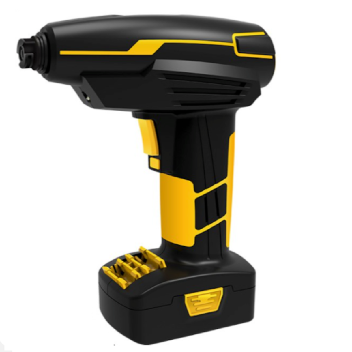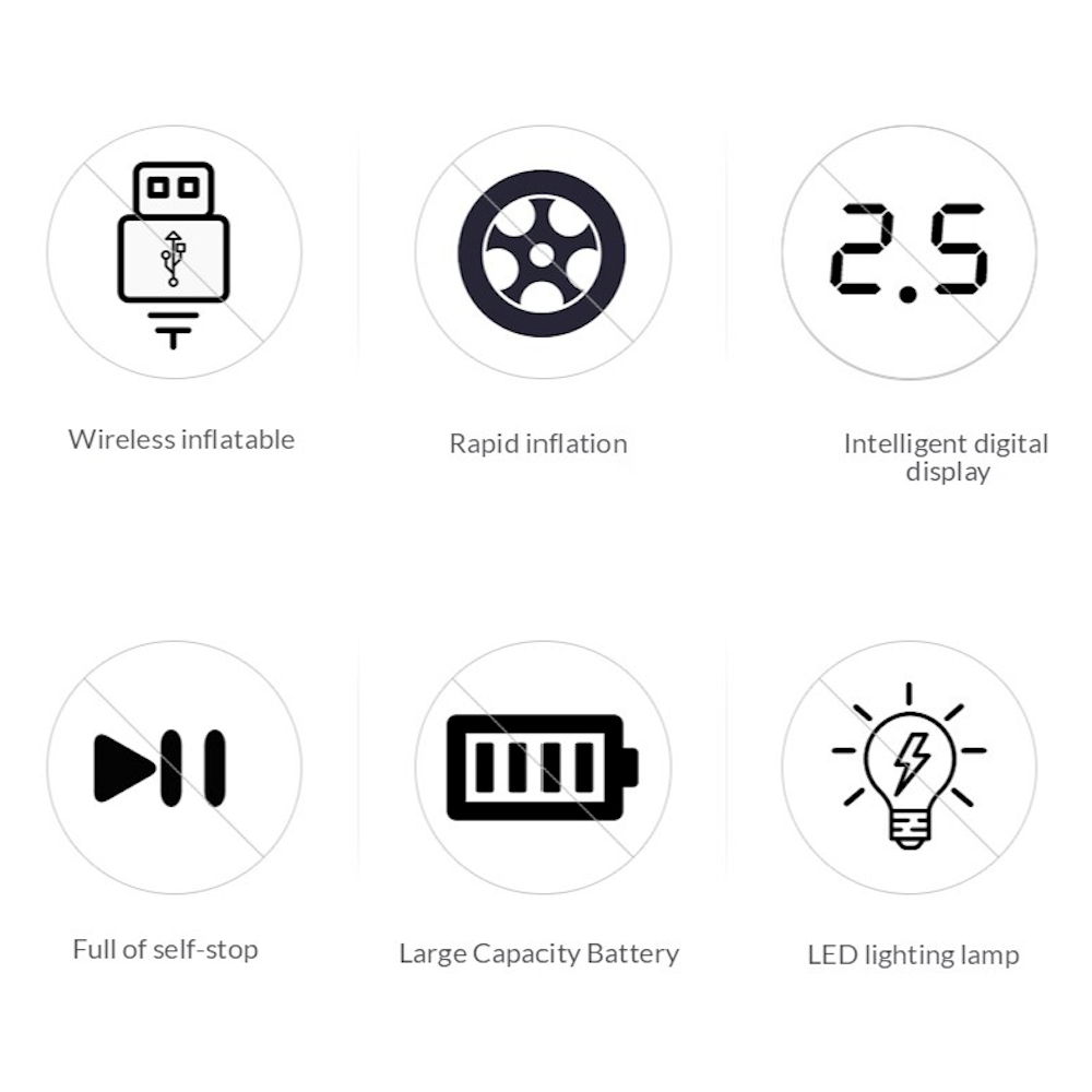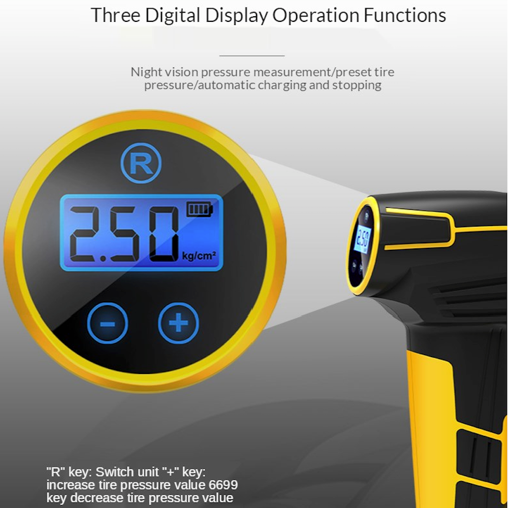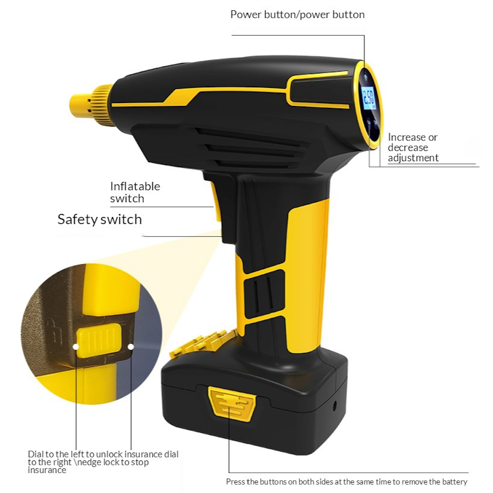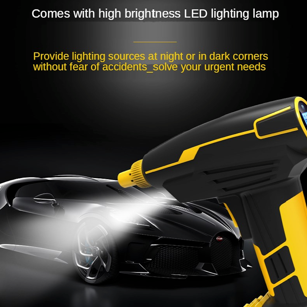 This handheld tire inflator air pump features a large 2500 mAh Li-on battery that stays charged for 12 months and can inflate up to 150 PSI, with a maximum of 102 PSI for car tires. It includes a built-in USB power bank, flashlight, long hose, and three adapters, all housed in a sturdy carton case. The cordless air compressor has a 35L/Min air flow and can fill a low tire in just 5 minutes. With an LCD digital pressure gauge and tire pressure monitor system, this inflator is easy to use and shuts off automatically when it reaches the preset pressure. It comes with different nozzles for multiple uses, including sports balls and other inflatables. The LED highlight automatically illuminates when inflating, making it perfect for use at night.