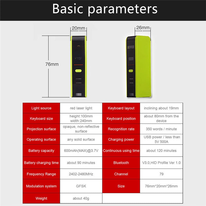 Looking for a stylish device to impress in your next business meeting? Look no further than this laser projection keyboard. Connect via Bluetooth to turn any surface into a functional keyboard for your mobile device. With a single touch, the virtual keyboard transforms into a mouse function, making presentations a breeze. The standard QWERTY layout, portable design, and rechargeable battery make this a must-have for on-the-go professionals. Compatible with Windows XP and above, Windows Phone7, iOS4, Android 2.0 and above, and Mac OS X and above. Comes with a USB charging cable and user manual.