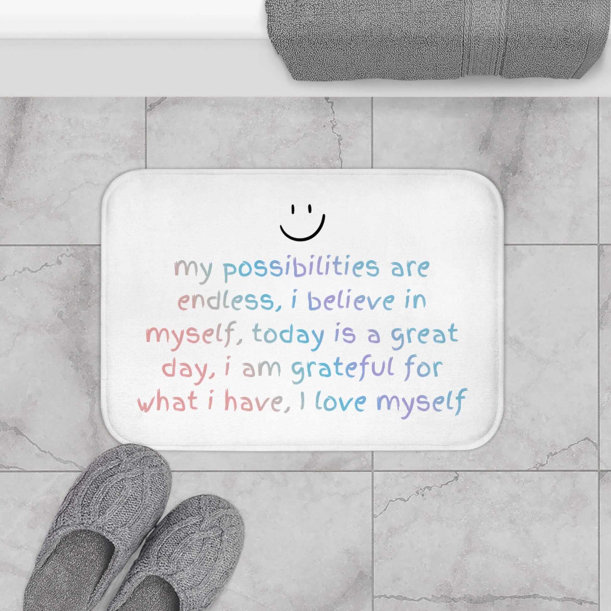Exceptionally crafted for the most intimate space in your home, indulge in our Positive Affirmation Bath Mat. This bath mat seamlessly combines functionality with high-end style. Our non-slip base ensures a secure grip, providing added safety. Immerse yourself in the plush comfort that only 100% microfiber can provide. With its meticulously bound edges, this bath mat exudes an air of sophistication. The perfect size of 24" x 17" guarantees a seamless fit in any bathroom. Experience the luxurious blend of safety and elegance with our Positive Affirmation Bath Mat.