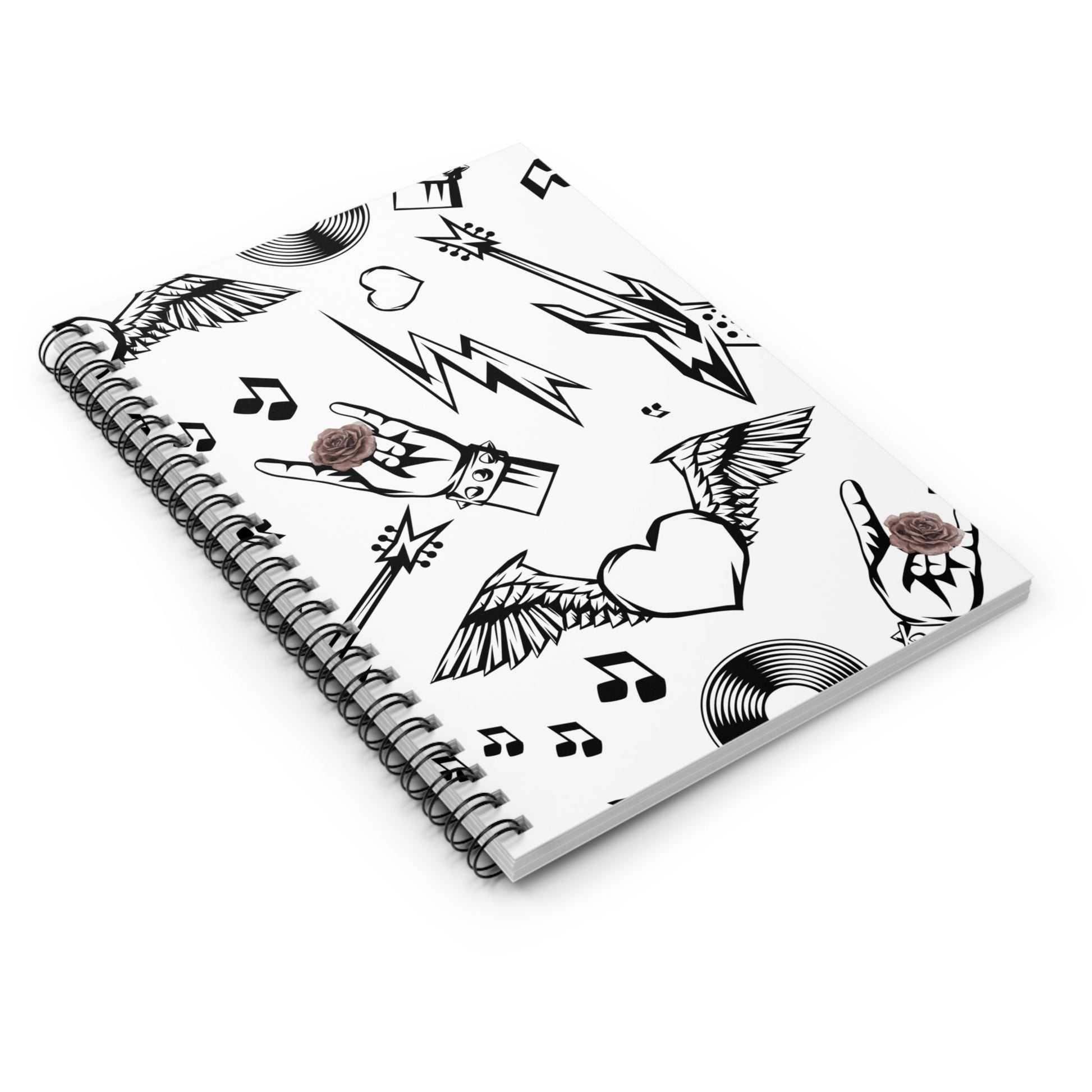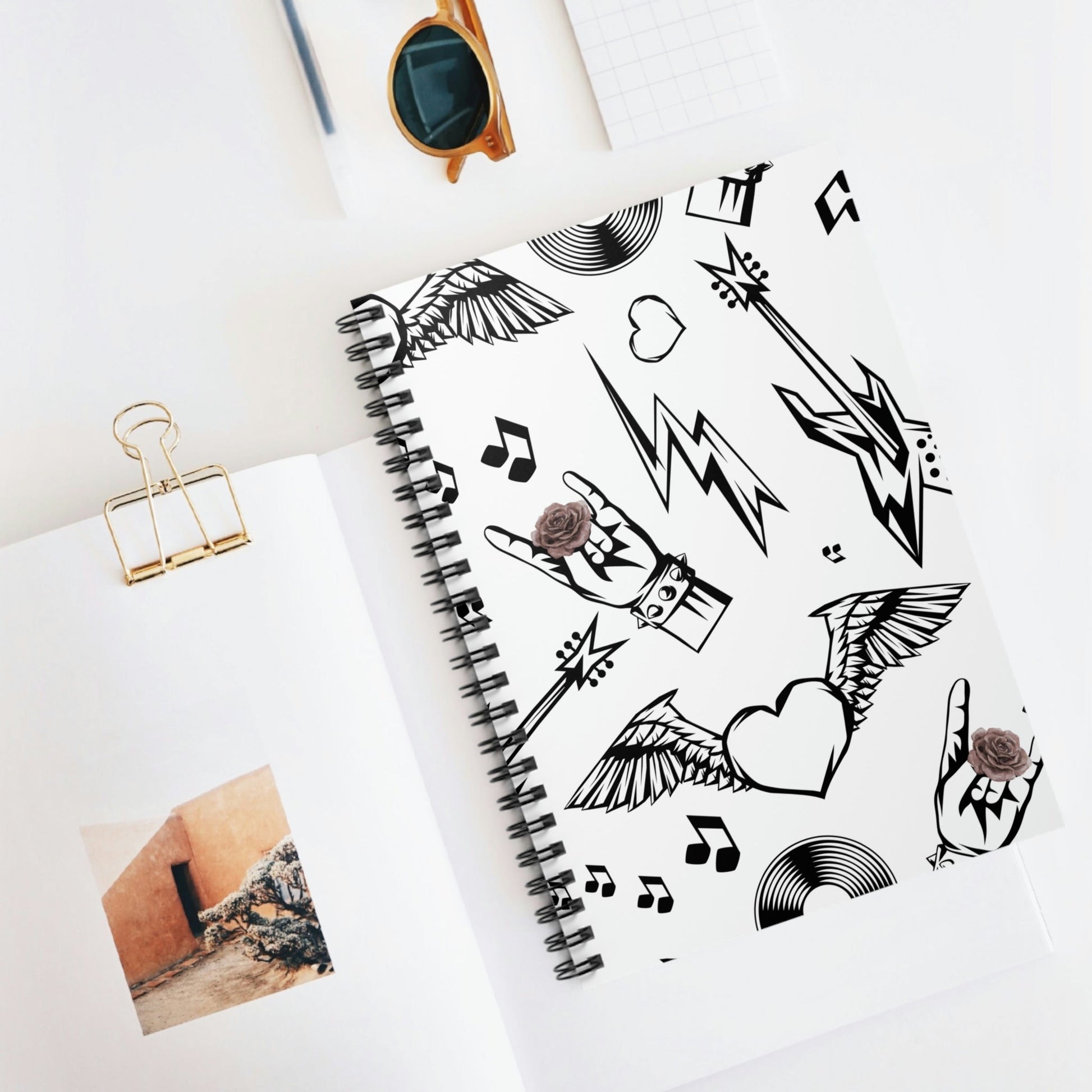 The Rock and Roses Spiral Notebook showcases a trendy and stylish aesthetic. This notebook lays flat, making it ideal for jotting down notes, daily reflections, or penning affirmations. It boasts a total of 118 pages with ruled lines, providing ample space for your everyday musings. The notebook's front cover features an eye-catching print, while the back cover sports a sleek dark grey color. Experience the perfect companion for all your writing needs.