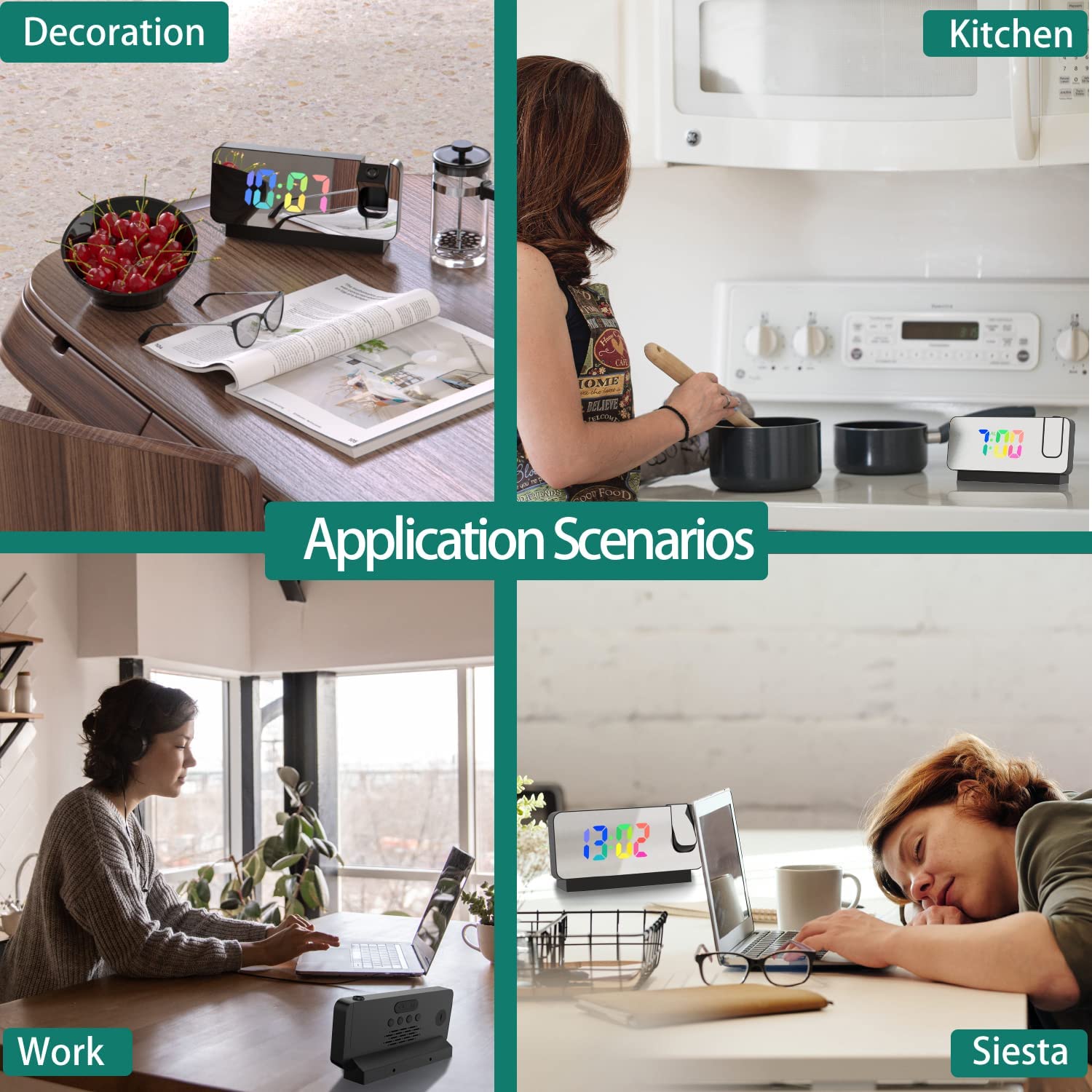 The Adjustable LED Digital Projection Alarm Clock ensures a timely wake-up. Easily adjust the time on its digital display and view the time from different angles with the adjustable LED projection. Equipped with a snooze button for those extra minutes of sleep. With its sleek design and bright display, this alarm clock is perfect for any room. This LED alarm clock projects the time onto the wall or ceiling with adjustable 180° angles. It features large, colorful LED numbers for easy reading day or night and a fashionable mirror surface for a unique touch. The clock has temperature notification, alarm and time display functions. Brightness can be adjusted for day or night. Made of plastic, it is powered by a USB charging cable. Package includes 1 alarm clock, 1 USB cable, and 1 manual.