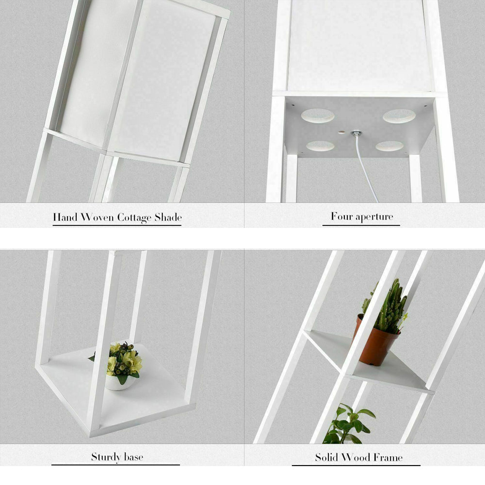 Contemporary Lamp with White Fabric Shades and Wood Shelving Below for Art or Books. Sleek lines and modern design. Features: Standing lamp with fabric shades, 1 E27 light base with easy access pull chain, shelf space for art or books, easy setup instructions. Specs: White shade color, made of fabric and wood, dimensions 63" x 10.3", E26 base lighting with maximum 100Watts and ETL certification, weighs 10 lbs. Light Bulb not included. Package includes: 1 White Shade, 1 Lamp, 1 Manual.