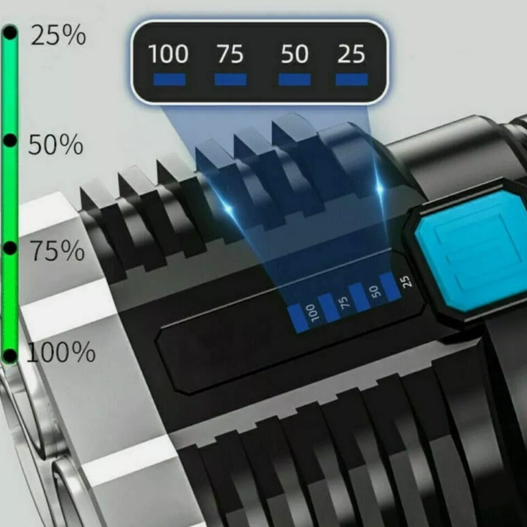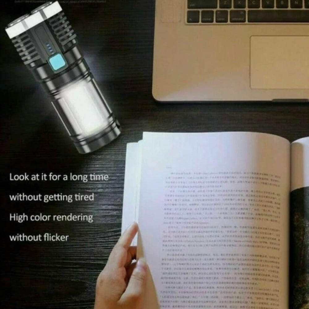 Unleash the extraordinary with this innovative flashlight, equipped with four built-in LED lightbulbs to deliver an incredibly intense light beam. Its waterproof feature ensures optimal performance in outdoor settings. The distinctive design boasts a side lamp, transforming the flashlight into a convenient stand-up lamp for nighttime reading or doubling as a camping lantern. With its powerful lamp beads, it produces an astonishing 100,000 lumens, surpassing ordinary incandescent lights by 40 times. Compact in size, measuring approximately 5.1" x 1.96", it is incredibly lightweight and easy to carry. The USB charging functionality provides real-time power display and ensures a battery life of 2 to 3 hours. With a built-in 18650mAh battery, this flashlight is a game-changer.