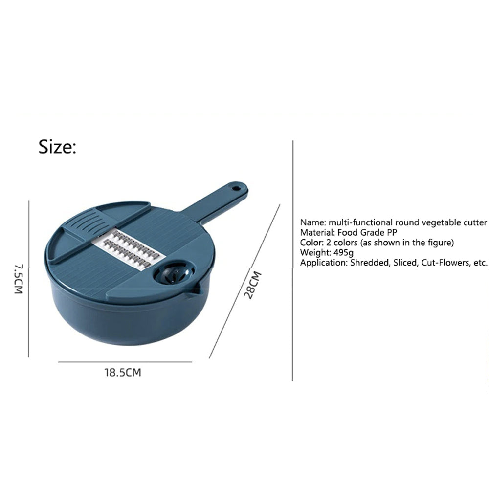 Simplify your kitchen tools with this 12-in-1 vegetable slicer. Made with premium quality materials, this versatile slicer effortlessly cuts through potatoes, apples, carrots, and various veggies. It features a safety guard to shield your fingers from the blades, as well as a drainer hole that doubles as a drain basket. The slicer comes with 6 replaceable blades, an egg separator, a peeler, a mandolin slicer, a grater, a cutting board, and a slicing cutter all in one device. Crafted from safe food-grade materials, this slicer is BPA free and uses wheat straw and PP material. The dark blue device measures 7.3" in diameter, 11" in length, and has a height of 3".