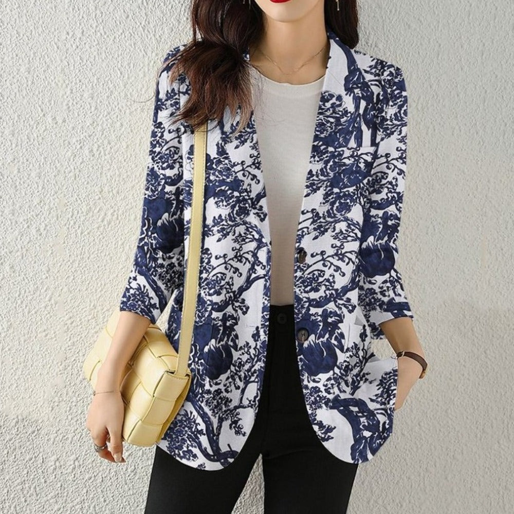 Introducing the Floral Blazer with Dual Buttons for Women - a stylish and versatile addition to your wardrobe. This sophisticated blazer showcases a charming floral pattern that seamlessly blends classic and contemporary elements. With long sleeves, it offers a perfect combination of comfort and coverage, making it suitable for various occasions, from work to casual outings. The refined dual button closure ensures a tailored fit, enhancing your silhouette. Crafted from high-quality materials, this blazer guarantees durability and a luxurious touch against your skin. The intricate floral design adds vibrancy and personality, making it easy to pair with both solid and patterned pieces in your closet. Whether you're dressing up for a business meeting or adding a fashionable layer to your everyday ensemble, the Floral Blazer with Dual Buttons is a go-to choice for a polished and trendy look. Elevate your style effortlessly with this timeless piece that will remain a wardrobe staple for years to come.