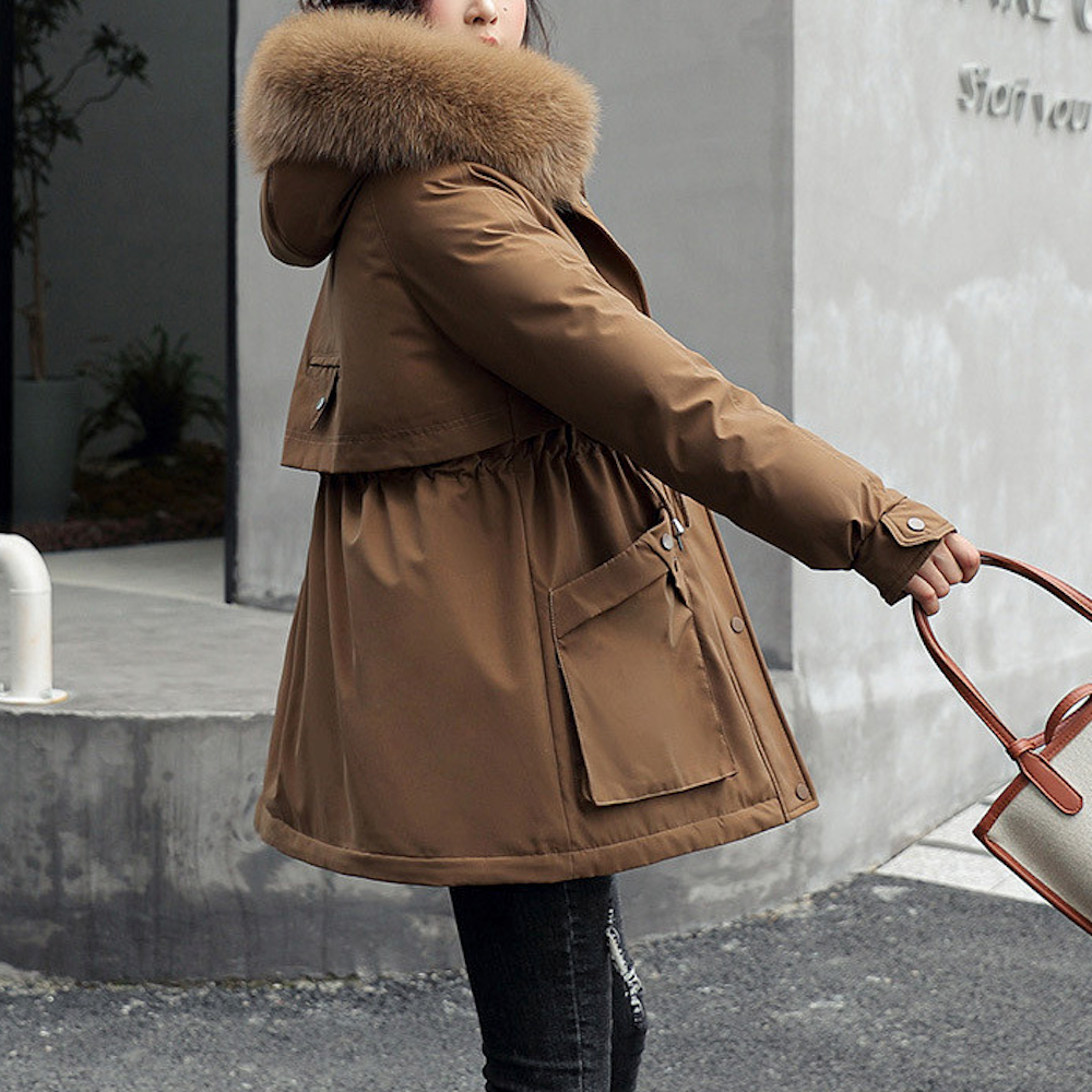 Introducing our Women's Mid Length Jacket with Drawstring Waist and Furry Hood! This jacket is designed to keep you warm and cozy with its soft and comfortable faux fur inner lining. It comes in a variety of colors including Brown, Blue, Pink, Khaki, Navy, and Black, and sizes S, M, L, and XL. The jacket is made from polyester and has a regular fit. Please note that there may be slight differences in measurements, but we've provided detailed size measurements for your convenience. Add this stylish and practical jacket to your wardrobe today!