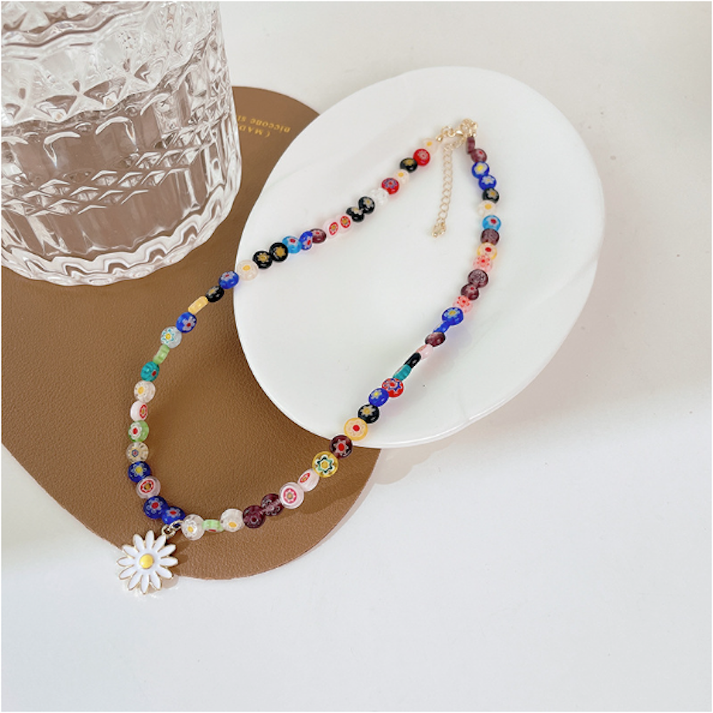 Rainbow Beaded Necklace with Daisy Pendant for Women