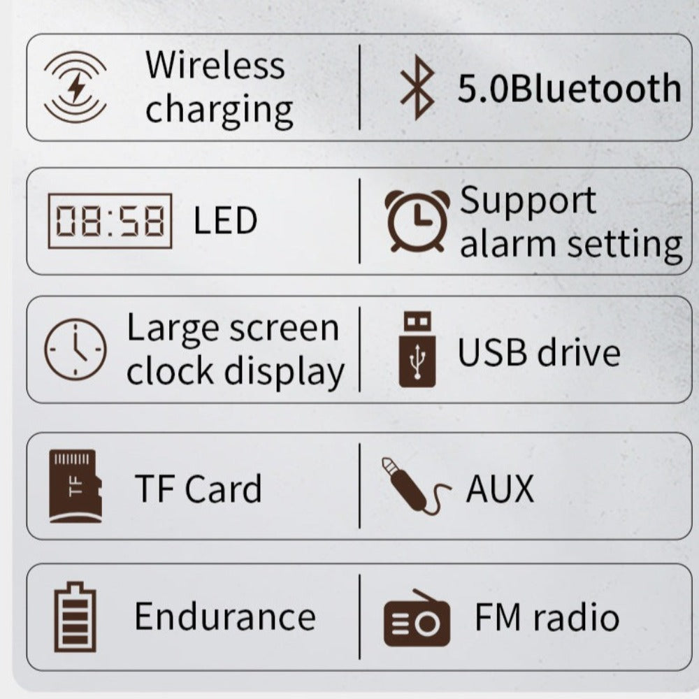 Incredible 4 in 1 device featuring wireless charging, Bluetooth speaker, alarm clock, and FM radio all in a single gadget. This multifunction gadget allows you to wirelessly charge your iPhone or Samsung smartphones while enjoying high-quality music with its Bluetooth speaker. Equipped with the latest Bluetooth 5.0 technology, this device ensures a strong and seamless connection. Its two 52mm speakers produce incredible sound that fills even a large-sized room. With a compact size of approximately 9.84" x 4.3" x 3.1" and a built-in lithium battery providing 3 to 6 hours of usage time per charge, this device is the perfect companion for your daily needs. Additional specs include various playback functions, a frequency range of 60Hz-23KHz, and a power output of 6W. Made with wood and ABS plastic, this device offers a powerful 10W output. It charges in approximately 2 to 3 hours, providing up to 6 hours of usage time. The warranty for this product is 60 days, excluding hardware and water damage.