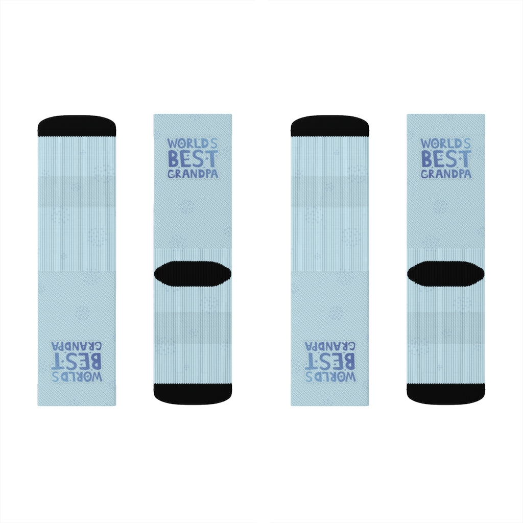 Indulge your grandpa with these premium socks featuring the "World's Best Grandpa" print. These socks are the perfect combination of comfort and style, suitable for any occasion. They can be used to complement your office attire or as a statement piece for any extravagant outfit. The socks are made of 60% polyester, 10% acrylic, 25% nylon, and 5% spandex, and are available in three different sizes. They feature a ribbed tube design and cushioned bottoms. The socks come in sizes that fit women's US shoe sizes 6-8 (S), 8.5-11 (M), and 11.5-13 (L), and men's US shoe sizes 5-6.5 (S), 7-9.5 (M), and 10-13 (L). Check the size guide to ensure the perfect fit.